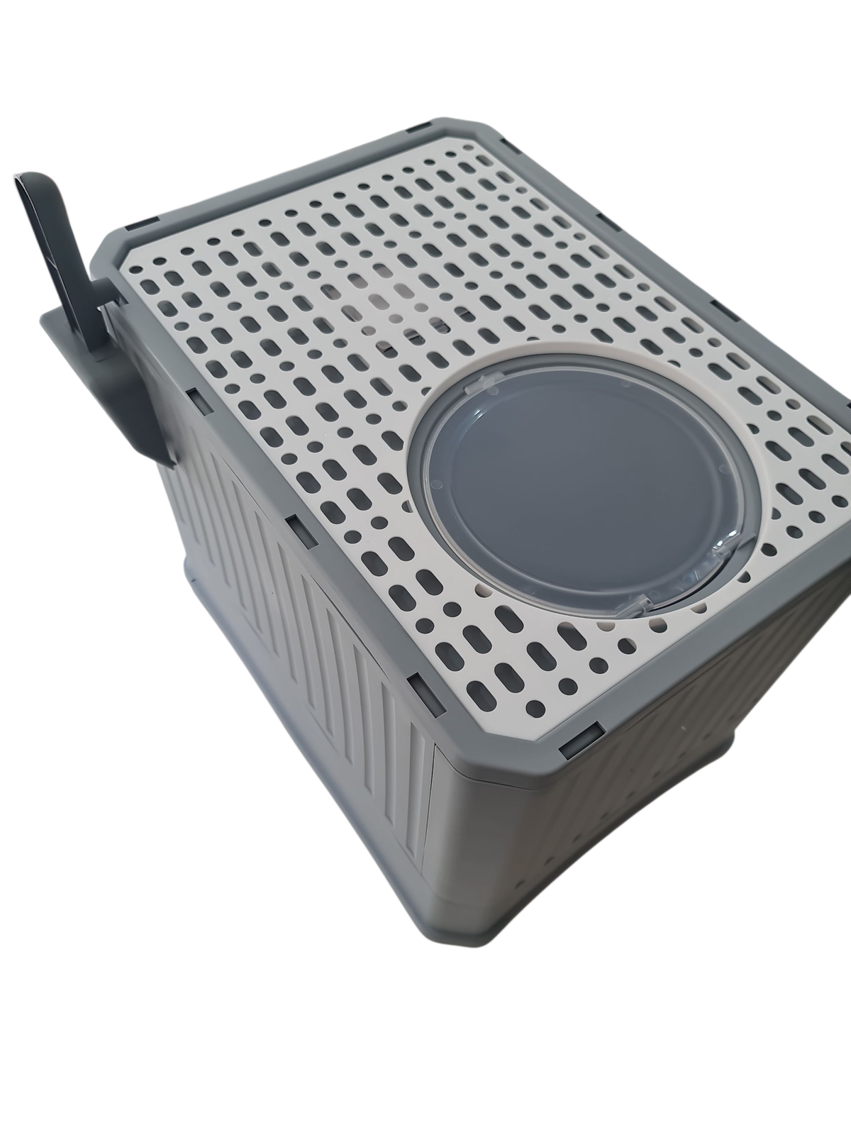 Es una arenera cubierta con una abertura en la parte superior, lo que ayuda a contener la arena y los desechos dentro de la bandeja.